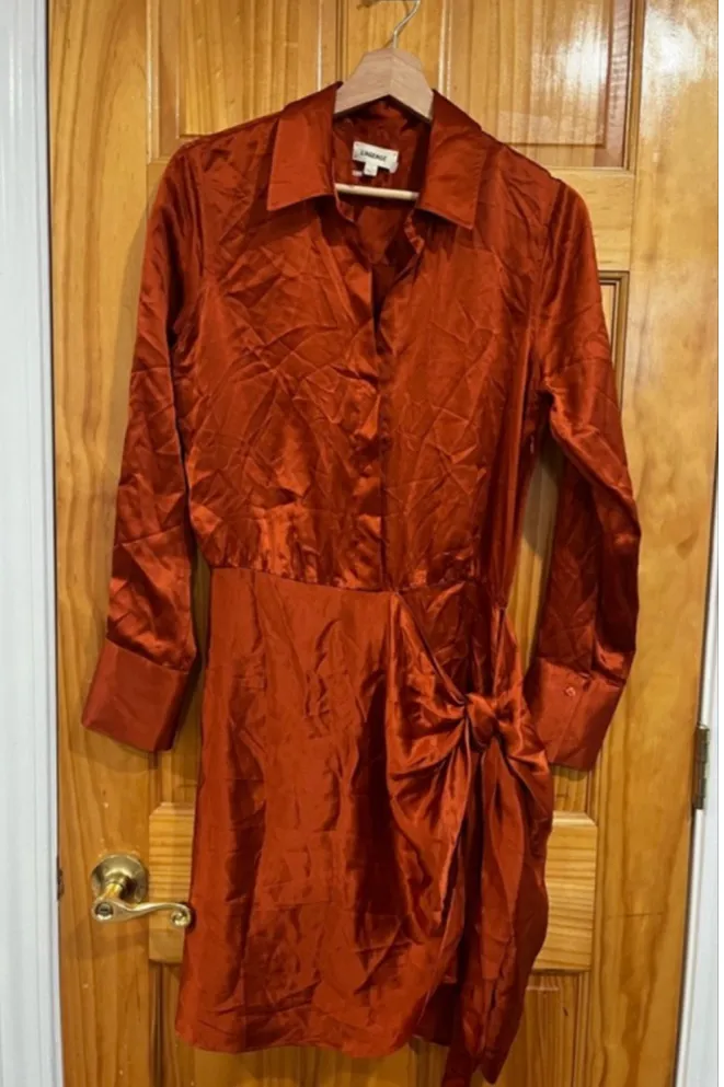 L’AGENCE Silk Tie-Front Shirtdress Brand: L’AGENCE Style: Silk shirtdress with draped tie-front bow detail Color: Burnt sienna / copper Material: 100% Silk Size: 4 Features: Collared neckline, button front, long sleeves, tie-front bow, flattering draped silhouette Condition: Gently pre-owned; shows typical silk wrinkling from storage (can be steamed). No major flaws noted.