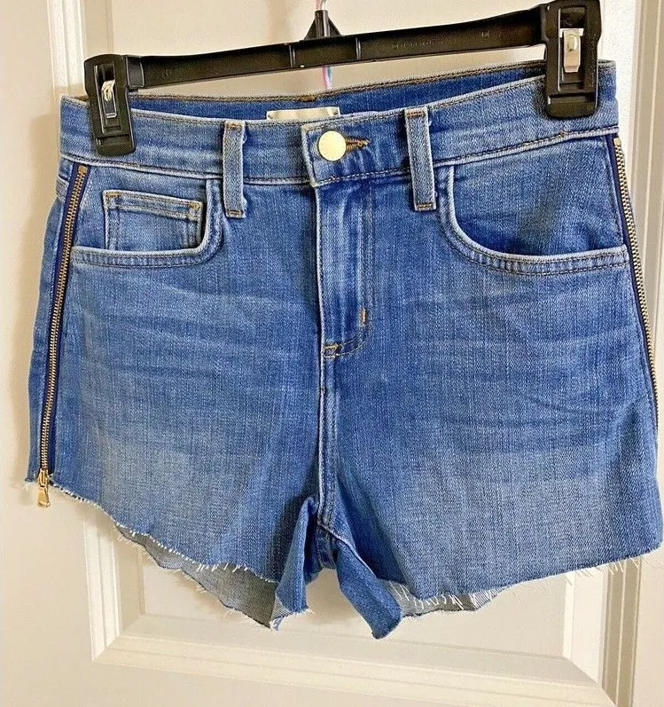 This listing is only for the L'AGENCE NWT Audrey Gold Zipper Womens High Rise Frayed Denim Shorts Size 24 other items in photo are just for styling ideas. * All items have been steam cleaned and/or washed.