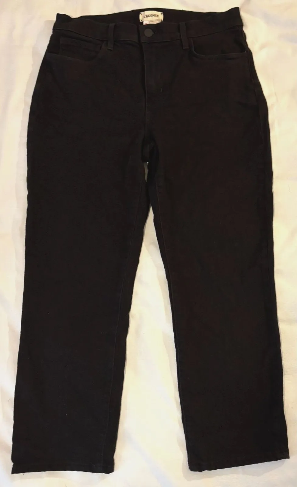 Excellent condition, please see photos. Retail $255 An essential cropped jean with an effortless, relaxed fit in saturated black. High-rise, five-pocket design is cut from premium stretch denim that holds its shape while providing supreme comfort. Slim straight leg * Rise: 11" * Inseam: 25" * 93% Cotton 6% Polyester 1% Spandex * Made in Los Angeles * Machine wash