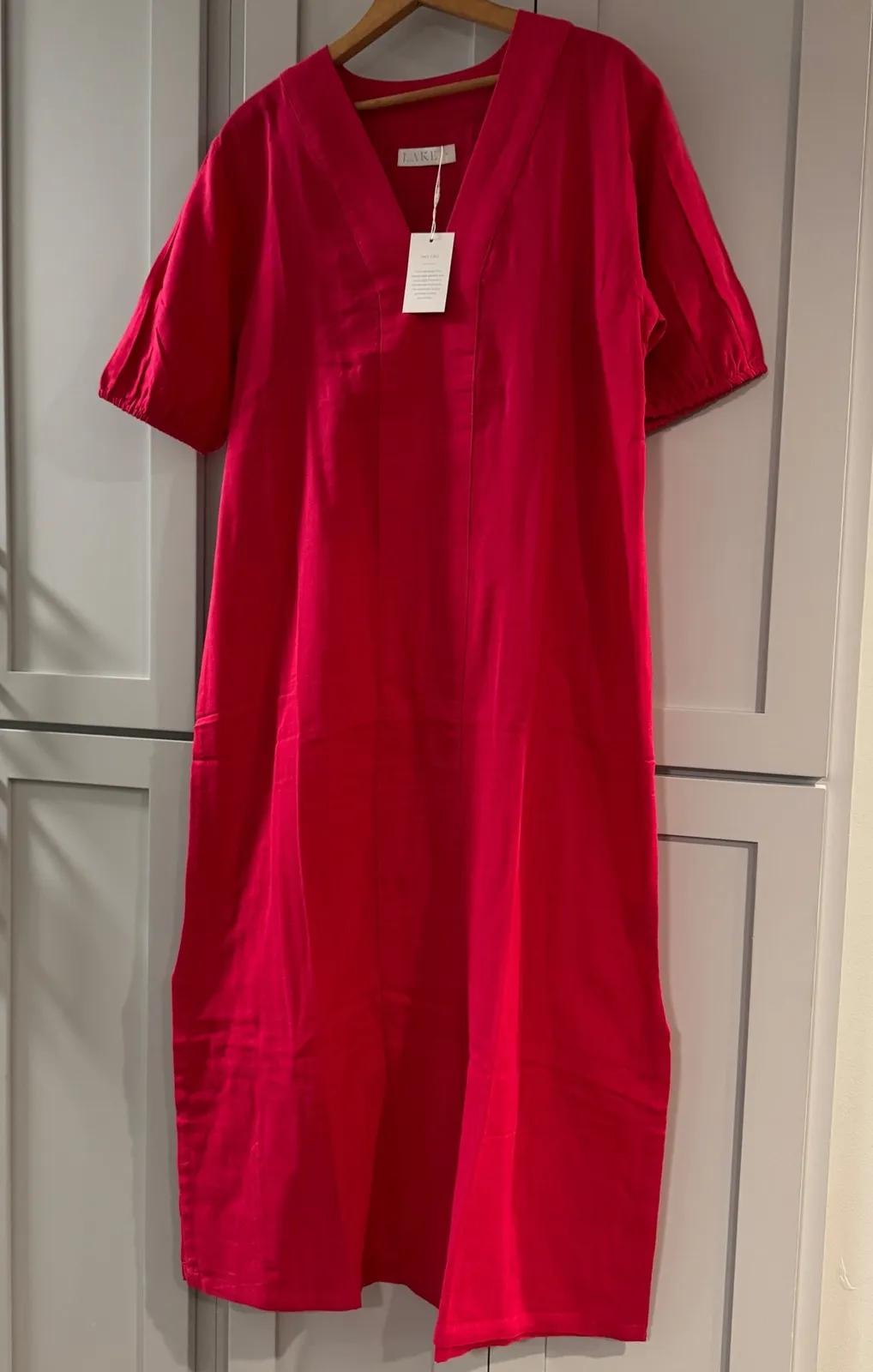 A bright red V-neck maxi dress from LAKE PAJAMAS. This comfortable and stylish kaftan features short, puffed sleeves and a flattering V-neckline. Its relaxed silhouette makes it perfect for a variety of occasions. Ideal for casual outings, lounging at home, or a relaxed vacation. Measurements: • Bust: 40 in • Length: 51 in Keywords: LAKE PAJAMAS, maxi dress, red dress, v neck, short sleeve, cotton dress, puffed sleeves, relaxed fit, casual dress, loungewear, vacation dress, summer dress, bright red