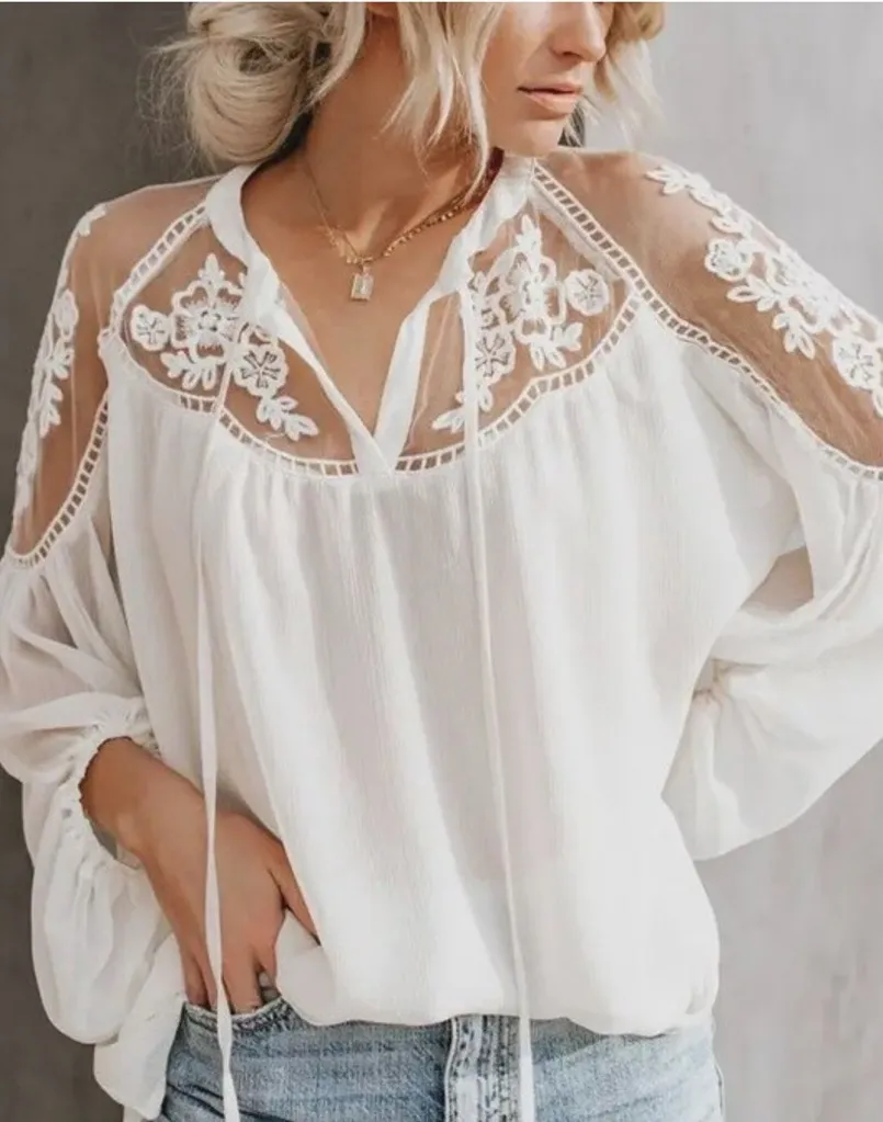Lala Factory Sz Large Tunic White Lace Sheer Floral Cut Out Long Sleeve Good pre-owned condition. The only flaw I noticed was a small pull on one of the drawstrings as shown in last photo. #boho #bohemian #beach #resortwear #lace #flirty #businesscasual #travel #vacation Ours is a smoke free home *See photos for approximate measurements and fabric content