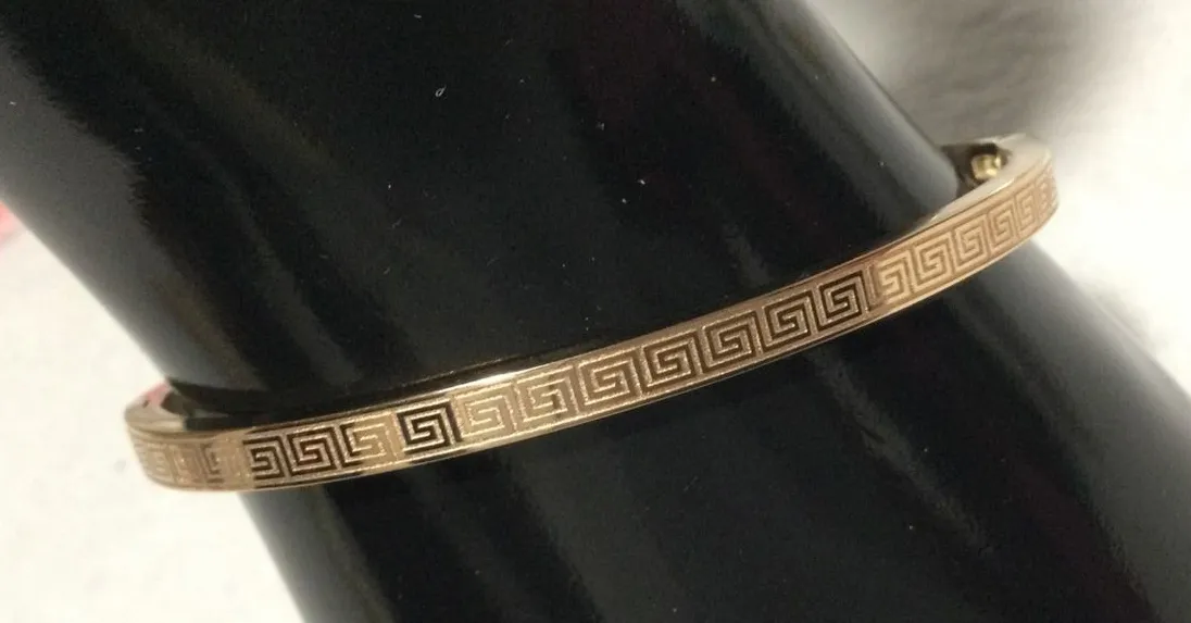 Exquisite allure adorns your wrist with this stunning bangle. The bracelet features a continuous Greek key pattern, lending an air of timeless elegance and sophistication to any ensemble. Whether you're aiming for a subtle touch of class at a business meeting or seeking to elevate your evening wear, this bracelet promises to complement your look flawlessly. Ideal for adding a refined touch to a casual brunch outfit or accentuating a formal cocktail dress. Measurements: • Diameter: 2.5 inches (approximate) Style: Bangle Type: Bracelet Color: Gold Main Stone Color: Gold Material: Metal Metal: Gold Plated Main Stone: No Stone Charm Type: Bead Shape: Round Main Stone Shape: Round Number of Gemstones: 0 Country of Origin: Greece Setting Style: Channel-Set Item Length: 7.3 in Cut Grade: Good Keywords: bangle bracelet, gold bracelet, Greek key bracelet, women's bracelet, fashion jewelry, gold tone, stylish bracelet, elegant bracelet, arm jewelry, bracelet for women, gold bangle, accessory, jewelry, contemporary bracelet