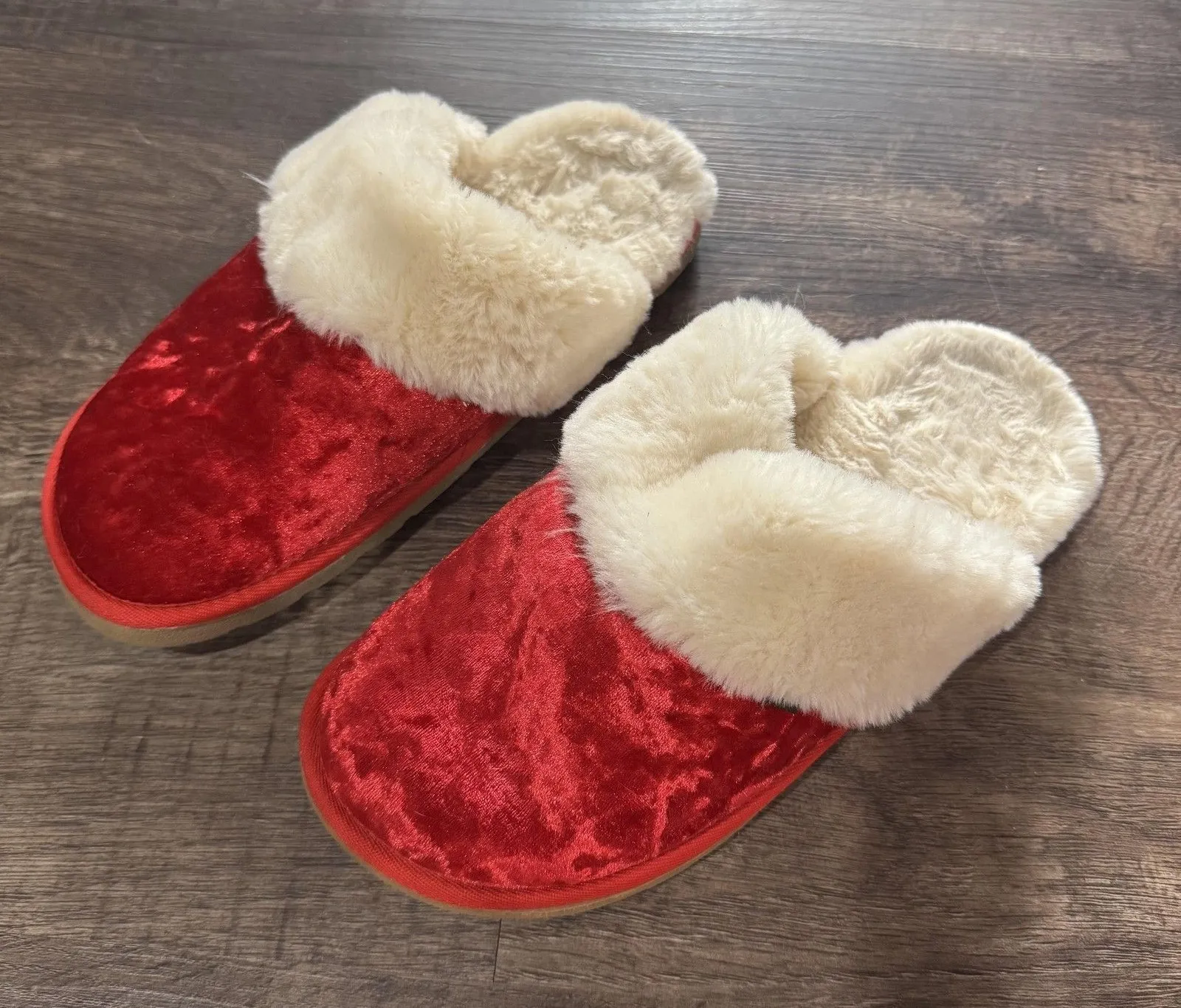 Brand: LAMO Style: Womens mule house slippers with backless slip-on design and plush faux fur collar. Color: Red velvet-look fabric upper with cream faux fur lining and trim. Size: Womens (tagged XL on sole and interior label). Materials: Fabric/velvet upper, faux fur lining and insole, textured synthetic rubber outsole. Details: Cozy faux fur footbed, flat under-1-inch heel height, solid red holiday-inspired design, comfortable indoor slippers with durable treaded soles. cpcloset