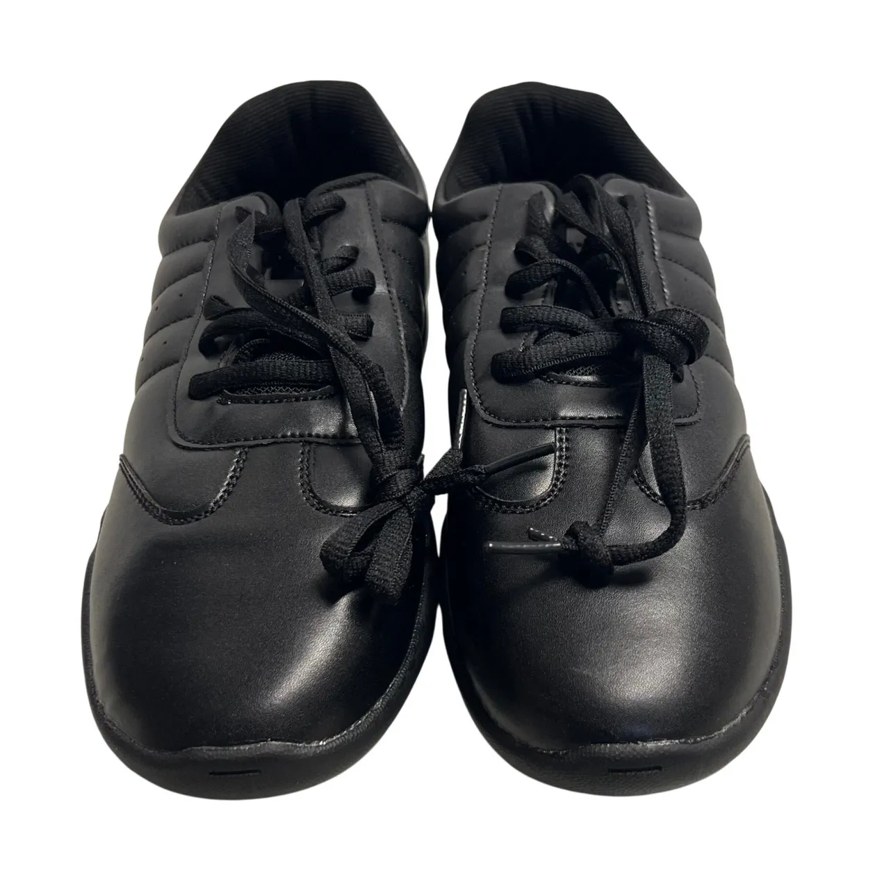 LANDHIKER black athletic sneakers. These shoes feature a classic lace-up closure and a durable sole designed for comfort and support. The sleek black leather upper offers a versatile look perfect for everyday wear or light athletic activities. Ideal for casual outings, gym sessions, or running errands. Measurements: • Heel Height: 1.5 in • Sole Length: 10 in • Sole Width: 3.5 in Department: Women's/Youth Style: Sneaker Shoe Width: Standard Shoe Shaft Style: Low Top Upper Material: Leather Theme: Dance Type: Athletic Performance/Activity: Walking, Gym & Training, Running & Jogging Features: Comfort, Padded, Lightweight, Breathable, Slip Resistant Insole Material: Fabric Pattern: Solid Keywords: athletic shoes, Cheerleading sneakers, black shoes, lace up, comfortable, walking shoes, footwear, everyday wear, gym shoes, light activity, supportive, school shoes, work shoes