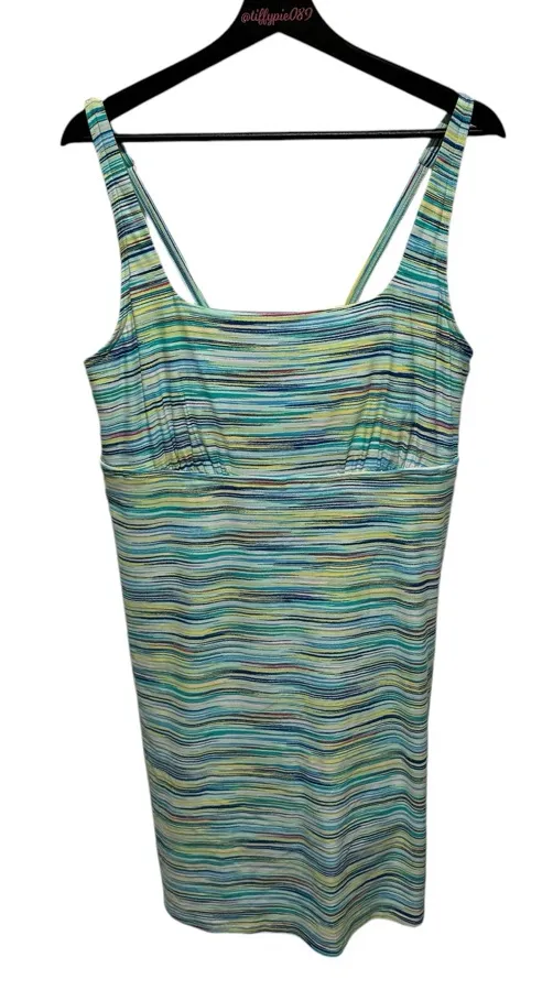 This knee-length swim dress by Lands' End features a multicolored striped pattern in shades of blue,... Show more