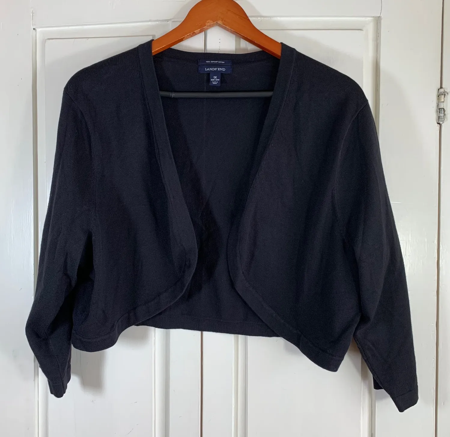 A black knit bolero cardigan from Lands End. This versatile piece features a cropped length and open... Show more
