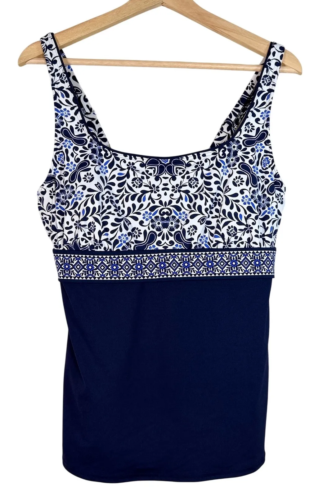 Lands End tankini swim top in navy blue featuring a vibrant white and blue floral print on the upper... Show more
