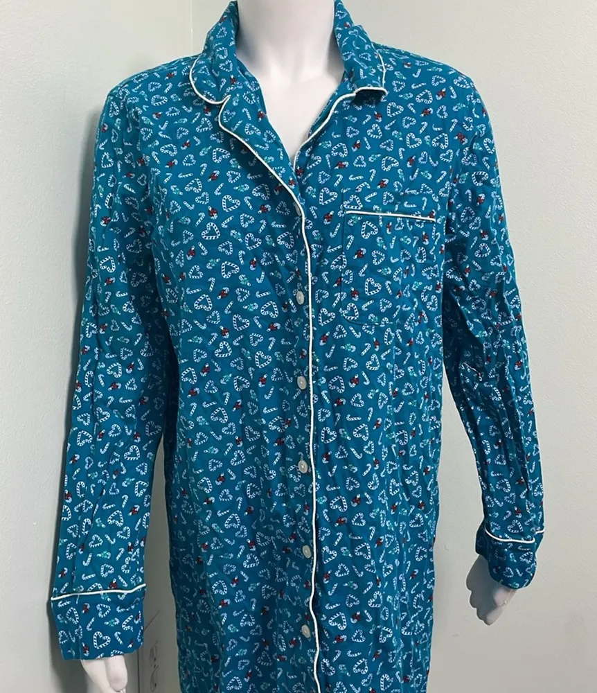 Holiday night shirt Button front with single chest pocket Fun candy cane heart print Excellent cond... Show more
