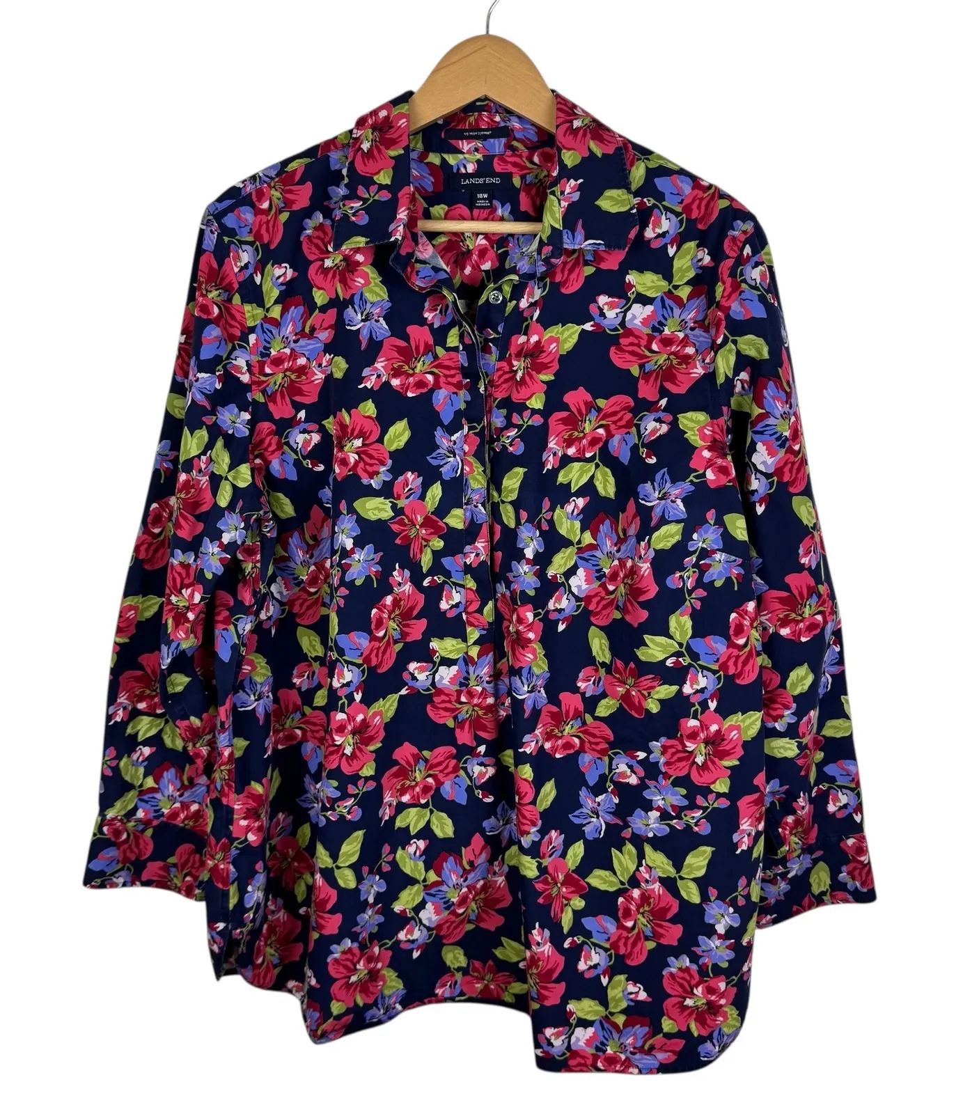 Keywords: Lands' End, floral shirt, button down shirt, long sleeve top, blouse, womens top, plus size, 18W, floral print, casual shirt, work blouse, classic style, cotton shirt, navy floral