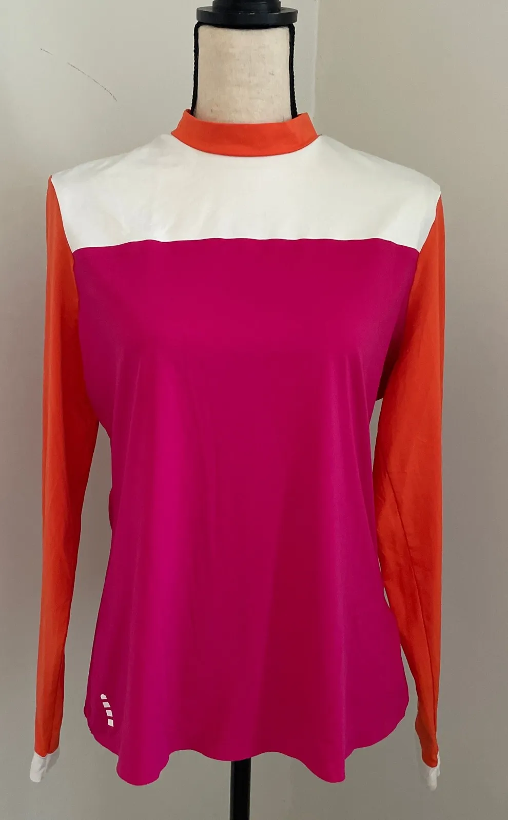 Lands End women's colorblock rash guard shirt in size XL. This long sleeve top features a vibrant combination of orange, hot pink, and white panels, creating a dynamic athletic look. The mock neckline and full zip back offer both style and functionality, making it ideal for active days outdoors.