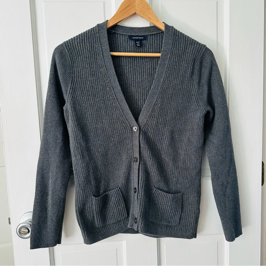 Lands’ End Ribbed Knit Gray Cardigan Sweater 100% Cotton V-Neck Great preowned condition Size S App... Show more