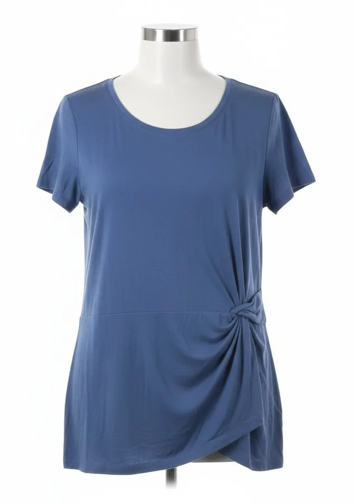casual top, knot detail, crew neck, basic tee, everyday wear, comfortable, cerulean, navy blue, short sleeve tee, side knot, tie waist, fitted, flattering, casual, chic, elevated basic, layering, preppy, vacation, resort, cruise, weekend, everyday