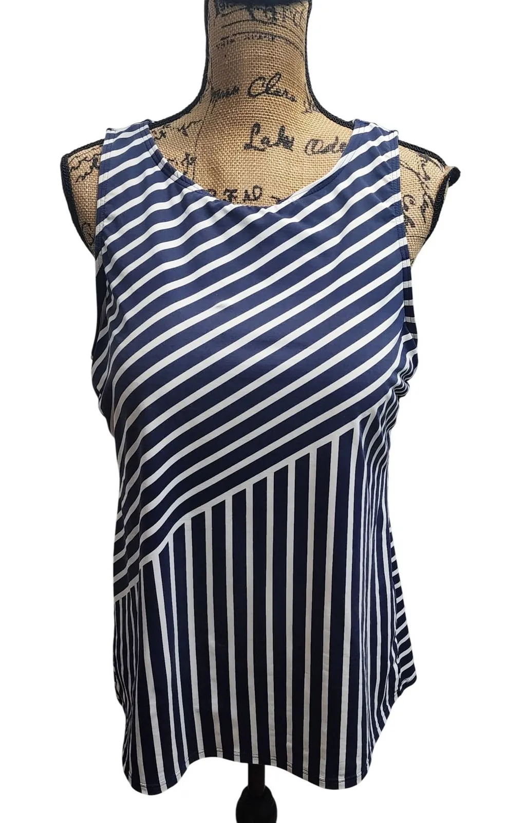 Lands End women's tank top in blue and white with an asymmetrical stripe pattern. This sleeveless to... Show more