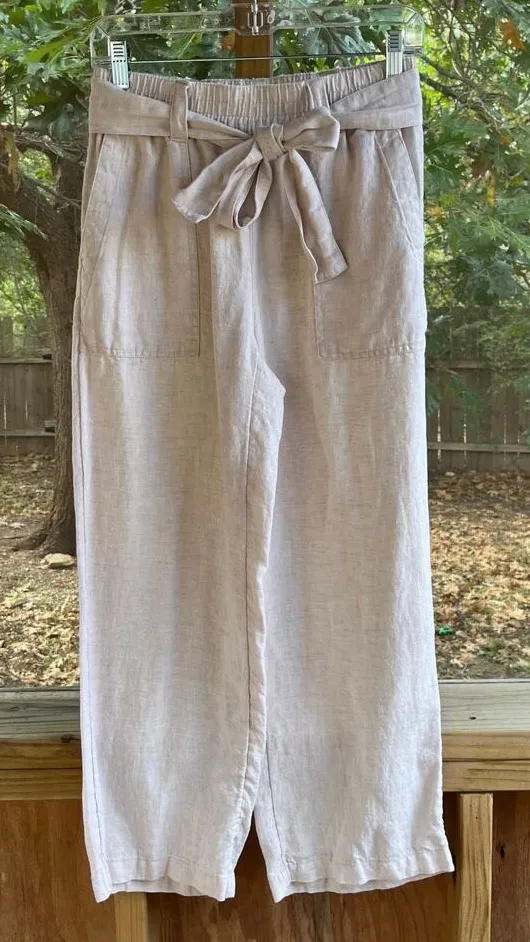 -In good pre-owned condition -Ankle/cropped length -Pull on styling with attached tie sash -Side sla... Show more