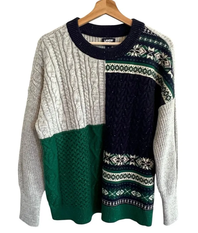 Lands End Womens Patchwork Fair Isle Cable Knit Sweater Fisherman Grandpa Chunky -Size SMALL -Excel... Show more
