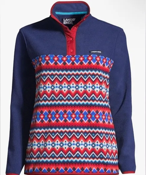 Lands' End New Heritage Fleece Snap Neck Pullover Red Navy Chevron Fairisle Large 14/16. Lands' En... Show more