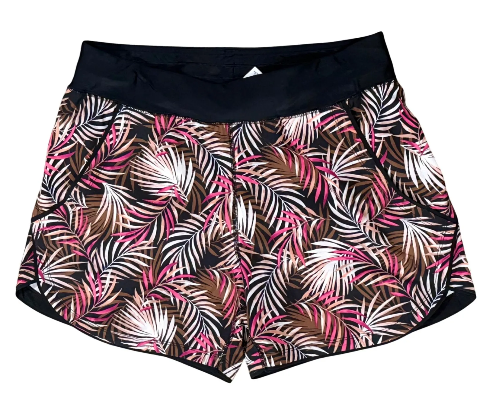 Dive into vibrant style with these Lands End Sport board shorts. The captivating palm leaf print in shades of black pink and brown evokes a tropical paradise, while the comfortable design ensures freedom of movement. Perfect for sunny beach days or poolside lounging. Built in swim bottoms. New without tags. Does have the sanitary sticker on attached swim bottoms Pockets Size 12 Inseam 5" Rise 11" Waist measured flat 15.5" Length of shorts 15" Department: Women Style: Athletic Theme: Hawaiian, Aloha Performance/Activity: Water Sports, Beach, Running & Jogging, Gym & Training Fit: Athletic Material: Polyester, Spandex Fabric Type: Microfiber Features: Elastic Waist, Moisture Wicking, Quick Dry, Lightweight, Breathable Pattern: Floral Keywords: Lands End, swim shorts, board shorts, tropical print, resort wear, beachwear, poolside, athletic shorts, vacation, summer, active lifestyle, sporty