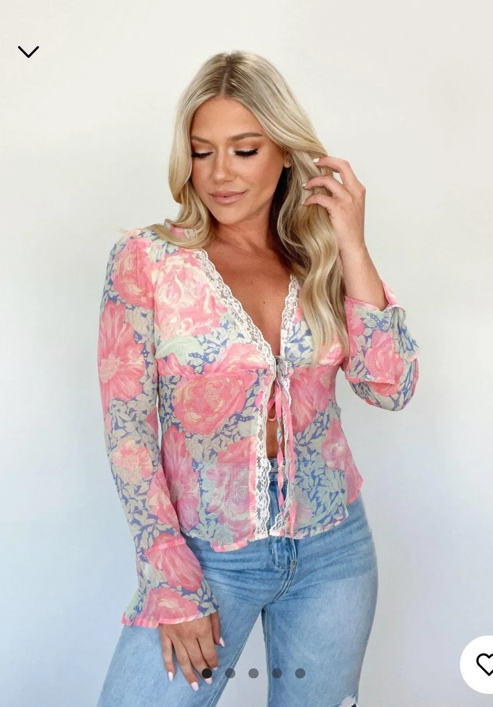 Worn once, excellent condition! Our Petalscape Tie Blouse is the perfect addition to your wardrobe for the summer season. Crafted from a light mesh fabric, this blouse features a V-neckline with lace trim, long sleeves, a stylish front tie detail, and a floral pattern for a sweet, elevated pop of color. Trendy, stylish, and effortlessly chic, this blouse will make a statement wherever you go. 100% Polyester Hand wash cold separately.