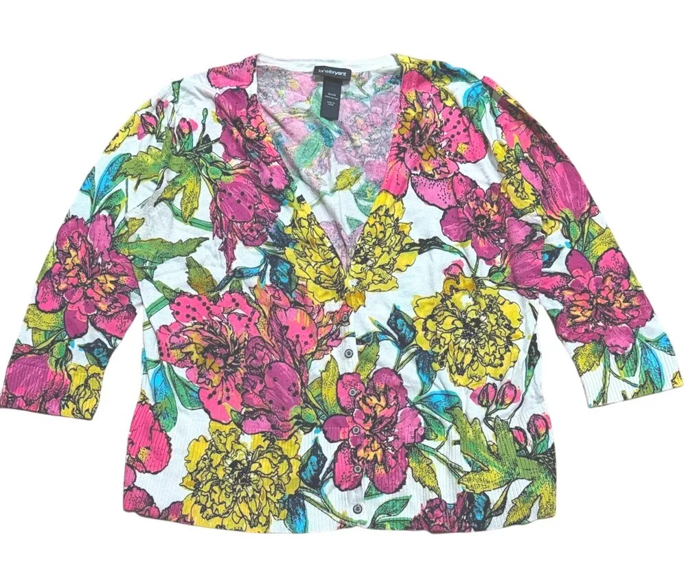 Lane Bryant bold floral design button-up cardigan sweater with black sequins and puff shoulder sleev... Show more