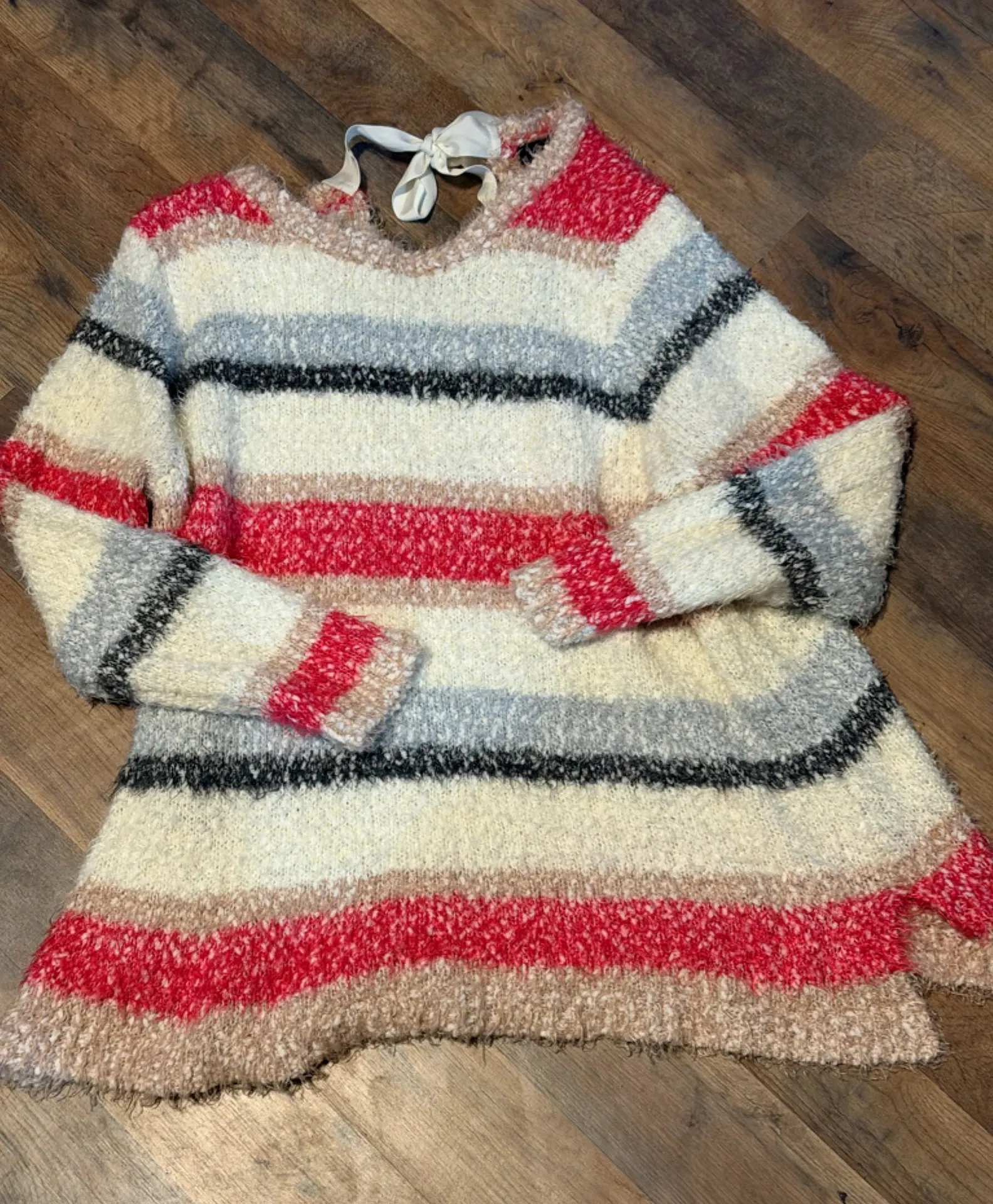 Soft and warm striped sweater. Features red, white, gray, and pink. Perfect for casual wear. Lane Br... Show more