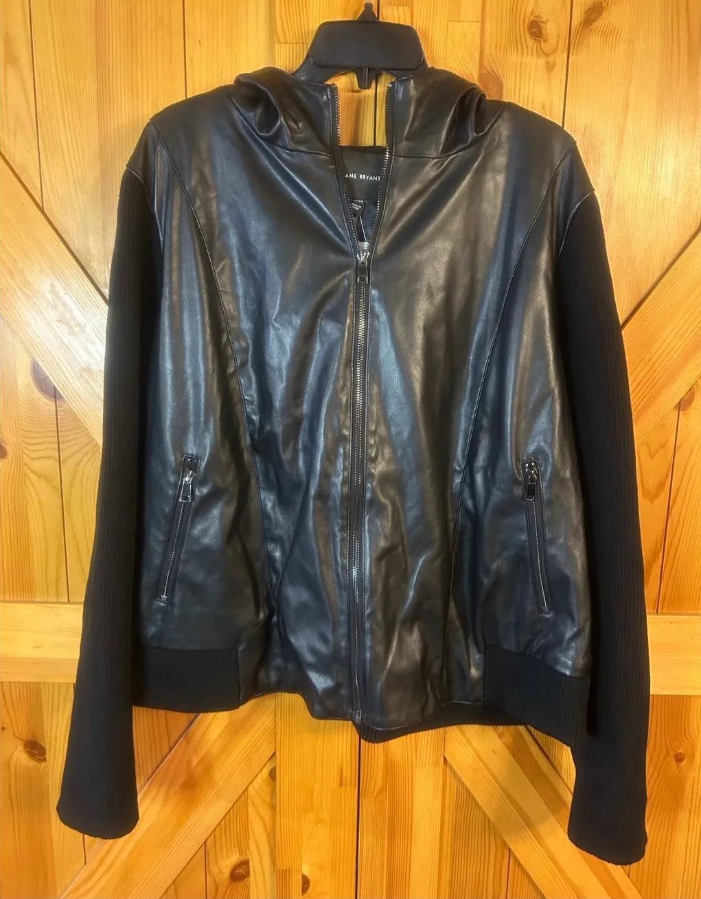 Lane Bryant Faux Leather Black Hooded Moto Jacket. Has ribbed sleeves and most of waist. Has front z... Show more