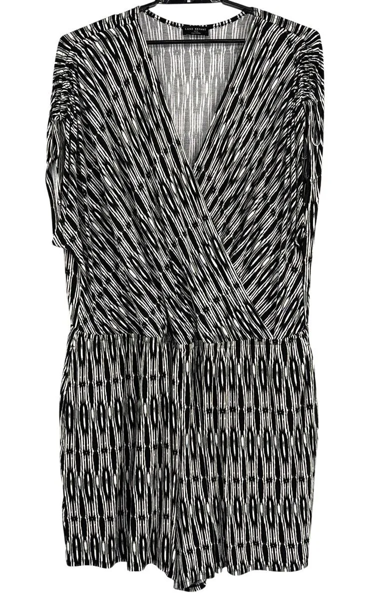 Lane Bryant Black White Ikat Wrap Romper Resort Minimalist Wide leg shorts and ruched tie short slee... Show more