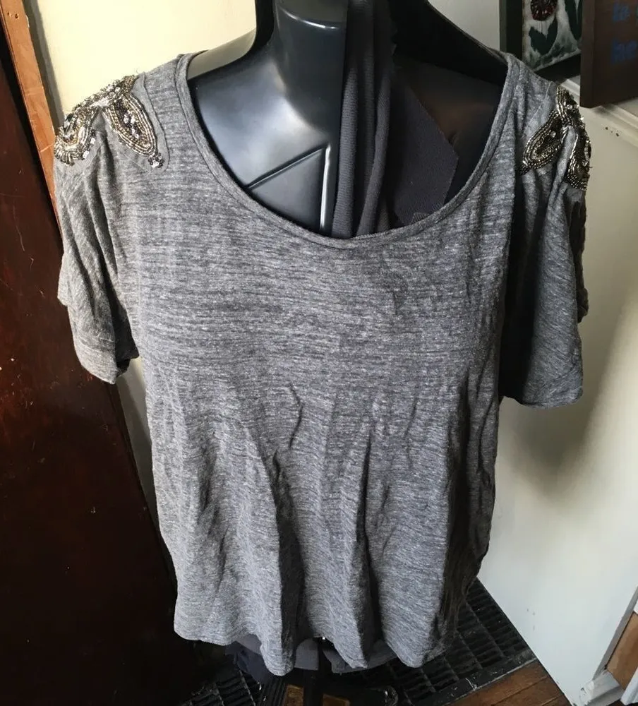 Beautiful bead floral detail gray T-shirt. In good, used condition. Approximately 25 inches from arm... Show more