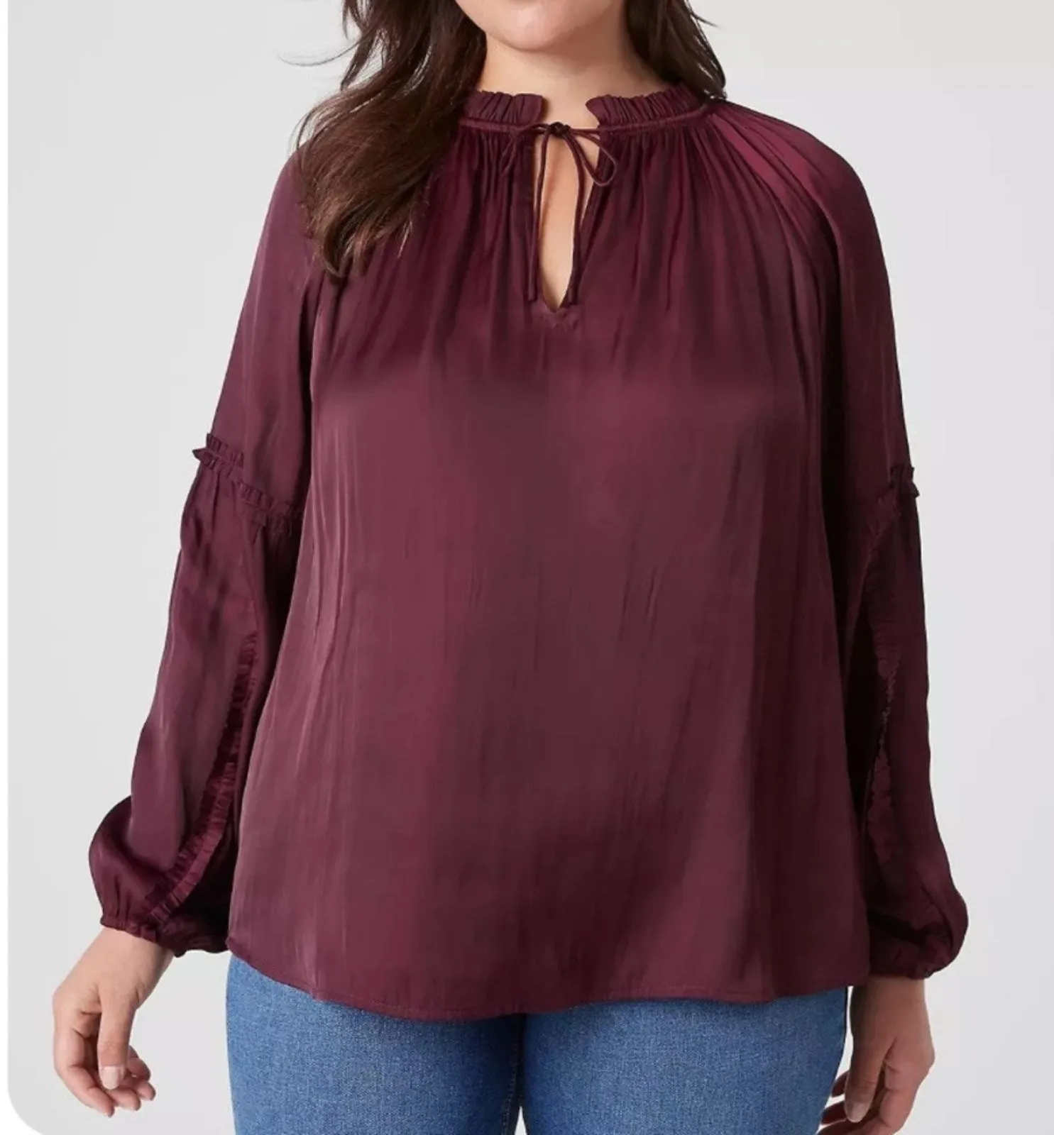Lane Bryant Maroon Dark Red Long Sleeve Ruffle Split Neck Top