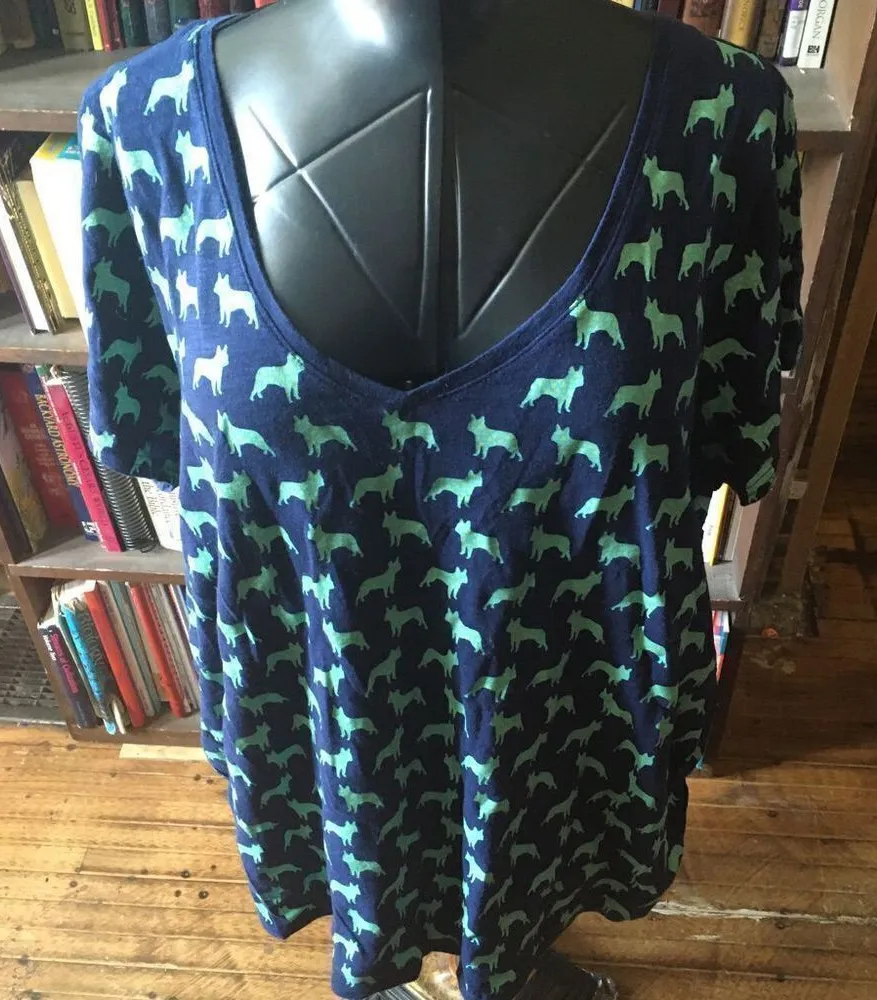 V-neck, navy and green, dog print knit top with ruched sides. In good, used condition. Approximately... Show more