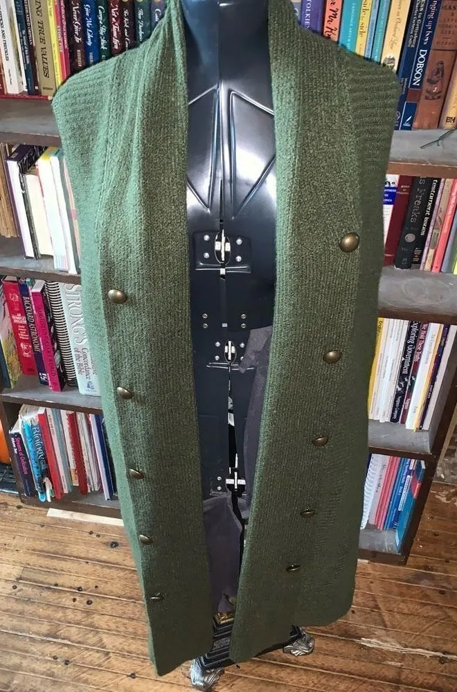 Lane Bryant olive green, crocheted, brass button, drape, sweater like, long vest. Approximately 27 i... Show more