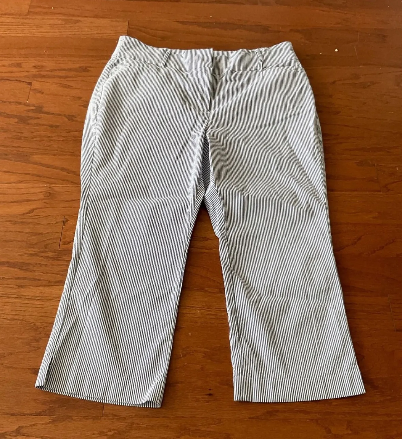 Lane Bryant cropped pants in a blue and white stripe pattern. These pants feature a wide leg silhoue... Show more