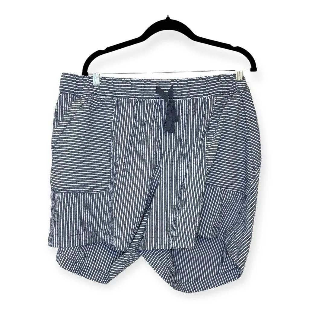 Breezy, nautical-inspired Lane Bryant shorts in a blue/white pinstripe with a lightly textured, seer... Show more