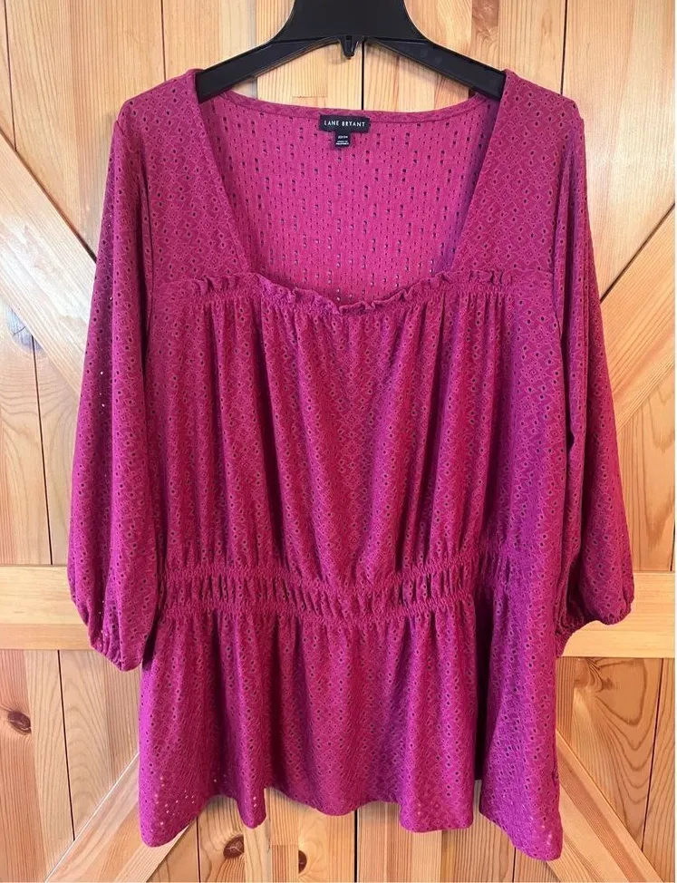 Lane Bryant Top Womens 22/24 Eyelet Lace Peplum Long Sleeve Casual Blouse Wine color stretchy elast... Show more