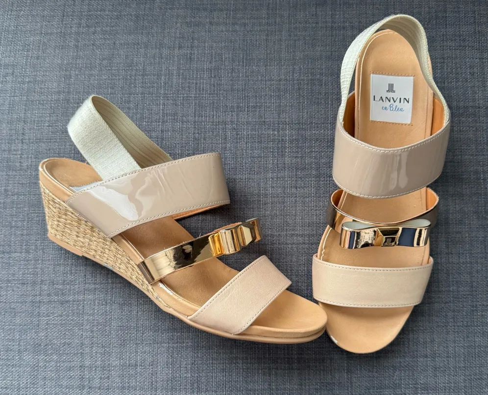 LANVIN en Bleu Ribbon Wedge Sandals (Platinum Combination) The wedge sandals that were very popular last year are back. The shiny straps that resemble ribbons are the highlight and are perfect for summer styling. The low wedge heel provides stability, making this a pair of shoes that you'll definitely wear all the time. Shoe size - 3US - 23 Heel height - 5.5cm Surface material - Genuine leather Details - Small scuffs along edge of leather as pictured