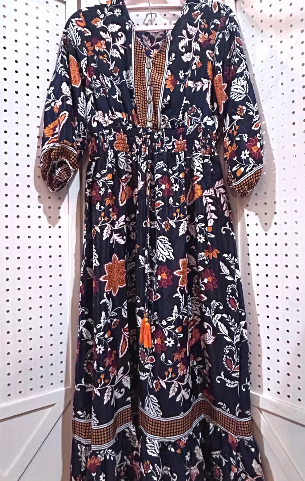 NWOT. Boho floral maxi dress in navy with vibrant orange and rust floral print. Features a V-neck with a decorative tie and tassels, a flattering smocked waist, and three-quarter length sleeves with a decorative cuff. The tiered skirt adds beautiful movement. Perfect for a beach vacation, a summer music festival, or a casual day out. Style: Maxi, Sundress, Kaftan Dress Length: Long Department: Women Sleeve Length: 3/4 Sleeve Pattern: Floral Occasion: Casual, Travel Material: Rayon Fabric Type: Rayon Theme: Nature, Indian Neckline: V-Neck Season: Spring, Summer, Fall Country of Origin: India - I ship in 1-2 days. - The more you bundle, the more free items you get! - Shop my closet for: jeans, workout, athletic, shoes, career, resort, vacation, swim, fall, work, lounge - Items are Wash-2-Wear (some Unwashed)!