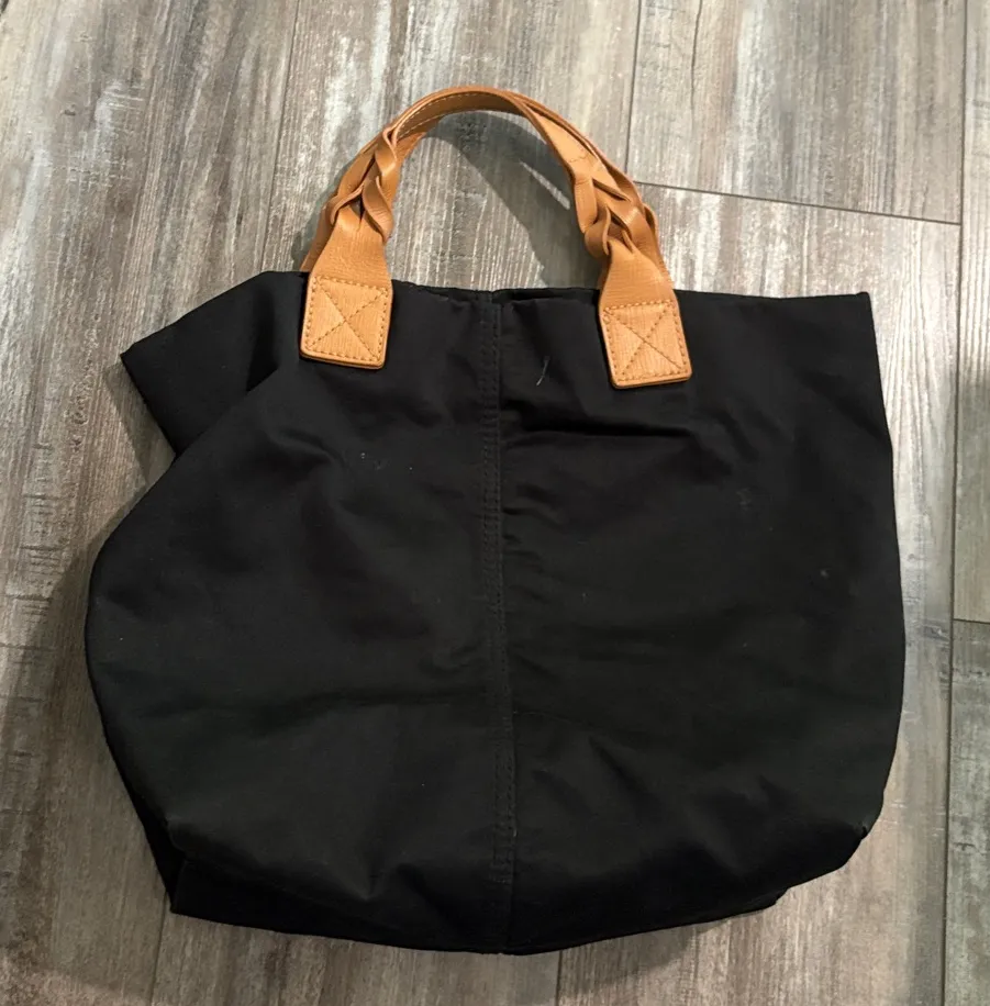 Lined black cotton bag with inner zip pocket Braided leather hand straps