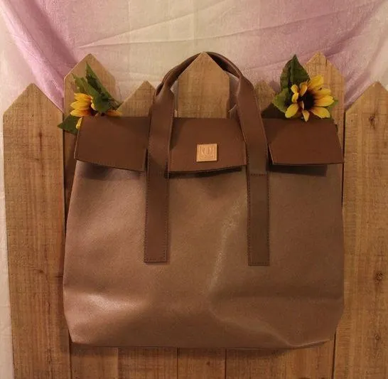 Tanger Large Tote Bag New without Tags This nice light brown tote bag is awesome for your shopping trips. The body is a vinyl type material and the trim is a leather-type material. The top folds over for convenience. It measures approx. 18"-16" Wide. 13.5" tall with a 5.25" gusset. The inside is lined with one zippered pocket. My items come from a smoke free home.