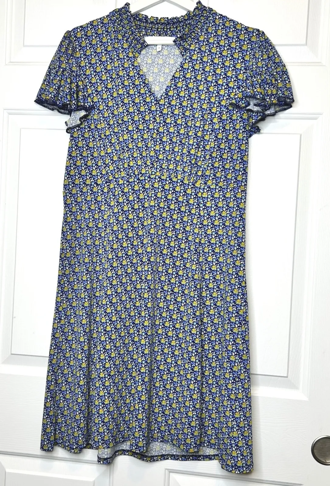 Lark & Ro Dress Size: 14 Pre-Owned with no stains or tears. A charming navy floral print dress with yellow and blue accents. This dress features a ruffled mock neckline, flutter short sleeves with ruffled trim, and a V-neckline cutout. Its A-line silhouette offers a flattering fit, perfect for a casual outing or a garden party. Measurements laying flat: Pit to Pit: 19 1/2" Waist (not stretched): 17 1/2" Length from shoulders: 36 1/2" Style: A-Line, Sundress, Trapeze & Swing Dress Length: Knee Length Department: Women Sleeve Length: Short Sleeve Pattern: Floral Material: Polyester, Elastane Theme: Flower, Nature, Colorful Neckline: V-Neck Sleeve Type: Flutter Sleeve Keywords: Lark & Ro, floral dress, ruffle dress, mock neck, flutter sleeve, A-line, short sleeve dress, garden party, casual, day dress, summer dress, vacation, spring Orders ship next business day. Smoke free home.