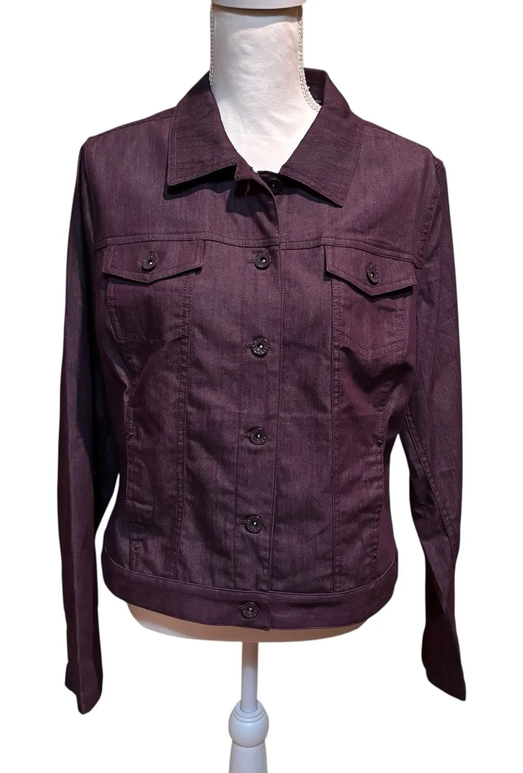 Brand: Larry Levine Stretch • Size: large Armpit to armpit 21 inches Length 22 inches • Color: Eggplant Purple • Style: Button-front denim-style jacket • Features: • Pointed collar • Button chest flap pockets • Button cuffs • Structured seams for a flattering fit • Fabric: Stretch blend (approx. 77% Cotton / 20% Polyester / 3% Spandex)