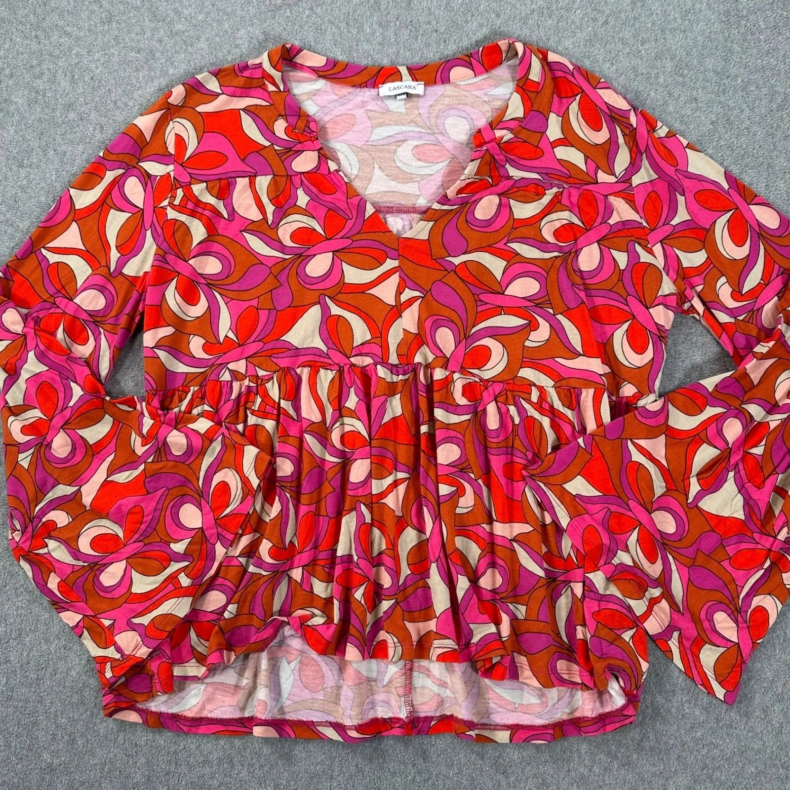 Size: 8/10 Condition: Good Pre-Owned Condition, Light Wash Wear, No Rips,Stains, or Tears.Please see all photos for most accurate representation of condition Color: Pink, Orange, Purple Closure: Pullover Pockets: No Material: 100% Viscose Sleeve Length: Long Sleeve
