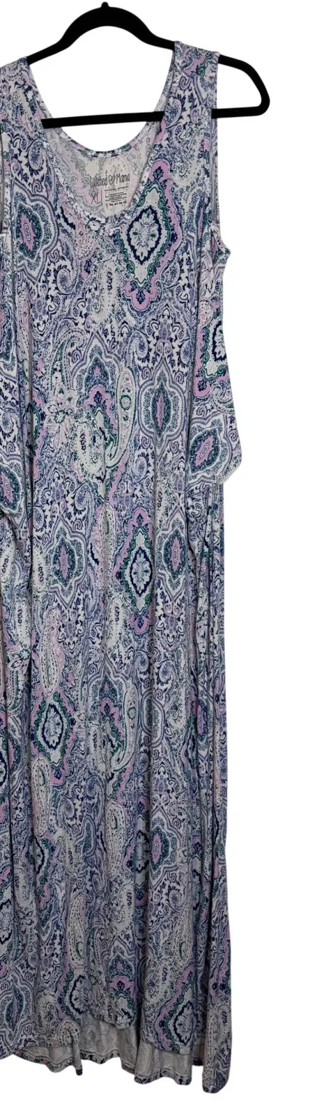 A sleeveless maxi dress by Latched Mama featuring a vibrant paisley print. This dress has a comfortable V-neck and a flowy silhouette perfect for warm weather. It offers a relaxed fit suitable for casual outings or lounging. Ideal for a day at the park or a relaxed brunch. Measurements: • Pit to Pit: 21 in • Waist: 20 in • Hips: 23 in • Length: 53 in Style: Maxi, Sundress, Tank Dress Dress Length: Long Department: Women Sleeve Length: Sleeveless Pattern: Paisley Occasion: Casual Material: Viscose, Spandex Fabric Type: Knit Theme: Tropical, Hippie Neckline: V-Neck Character: Mom Season: Spring, Summer Sleeve Type: Strappy Sleeve Closure: Pullover Accents: Layered Keywords: Latched Mama, maxi dress, paisley print, sleeveless dress, V-neck dress, plus size, casual dress, summer dress, boho dress, loungewear, travel dress, maternity dress