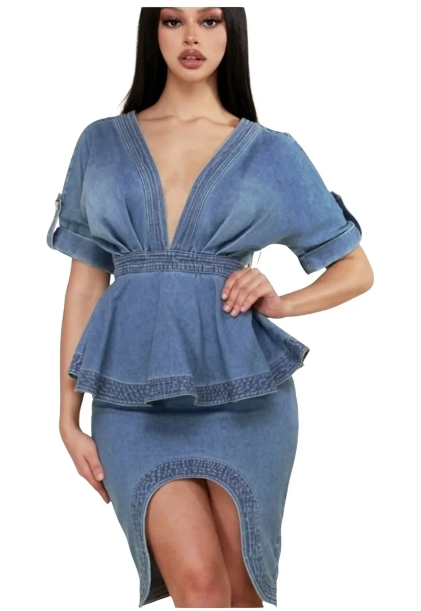 Make a statement with this unique denim dress! The flattering V-neckline plunges into a stylish bodi... Show more