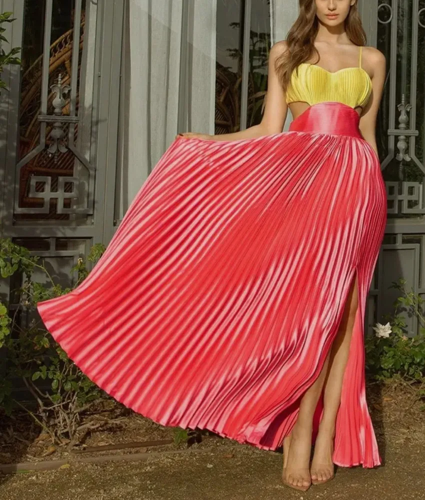 L'ATISTE satin pleaded maxi in excellent condition Waist cut outs Side slit Invisible zipper back... Show more