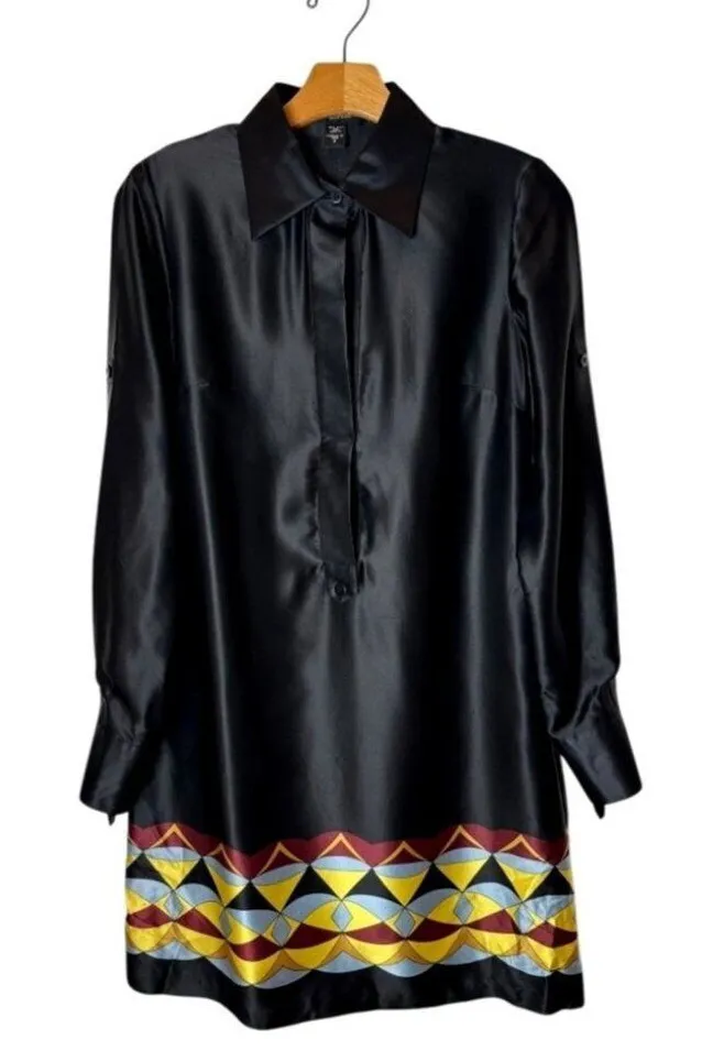 Prepare to dazzle and confuse your friends with this black satin tunic dress! It’s like wearing a silky night sky, but with geometric shapes that scream, “I’m artsy and I know it!” Perfect for when you want to look sophisticated, but also slightly mysterious.