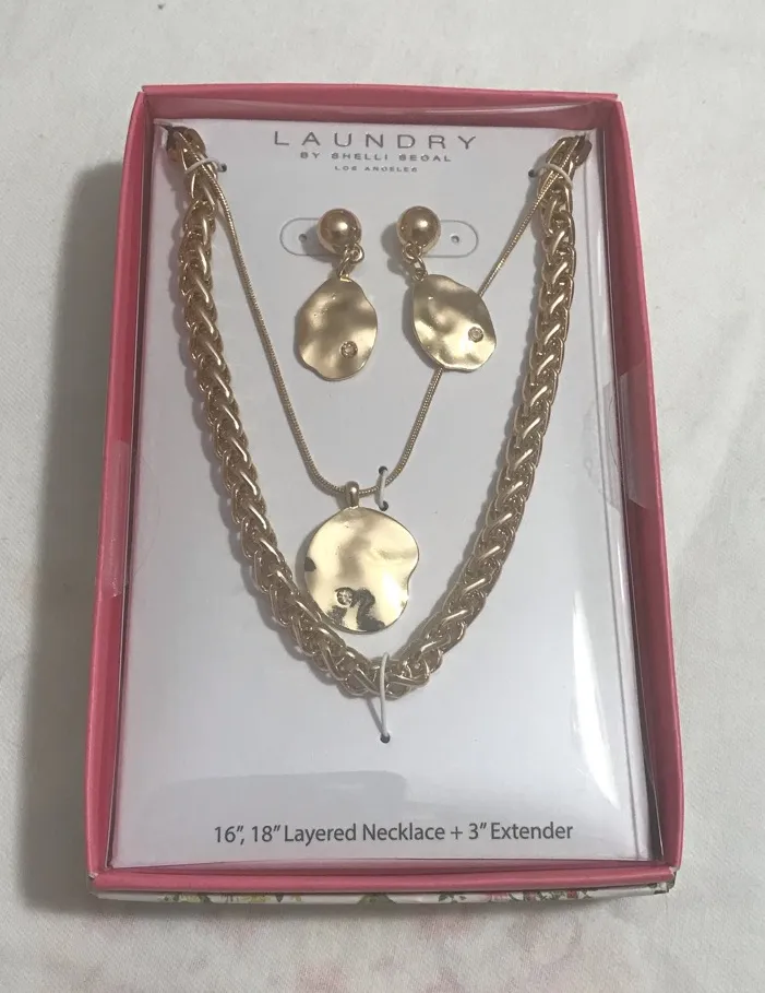 Laundry by Shelli Segal Gold Tone Layered Necklace Earring Jewelry Set Hammered Pendant NWT 16” inch... Show more