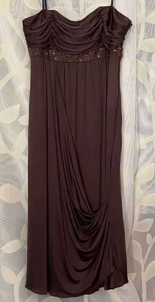 This deep brown shelli segal strapless dress is beautiful and has beads sewn into it under the chest... Show more