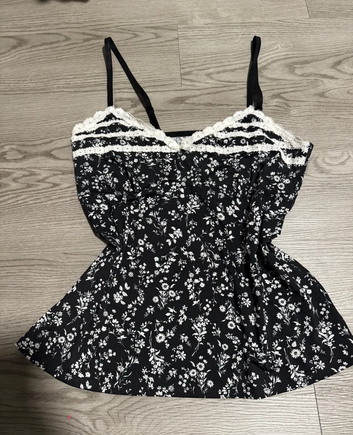 Effortless charm abounds in this delightful floral cami top. A cascade of dainty white blossoms dances across a sleek black backdrop, creating a visually captivating piece. The delicate white lace trim adds a touch of feminine elegance along the neckline, enhancing the romantic allure of the design. Thin black straps provide a comfortable and secure fit, while the sleeveless cut allows for maximum breathability and movement. Perfect for a sunny picnic in the park, a casual brunch with friends, or a relaxed evening stroll, this cami top promises to elevate any outfit with its understated yet chic appeal. Measurements: • Pit to pit: 16 inches Keywords: floral cami, black cami top, white floral tank, lace trim cami, sleeveless blouse, summer top, floral print, cami top, tank top, women's top, blouse, casual top