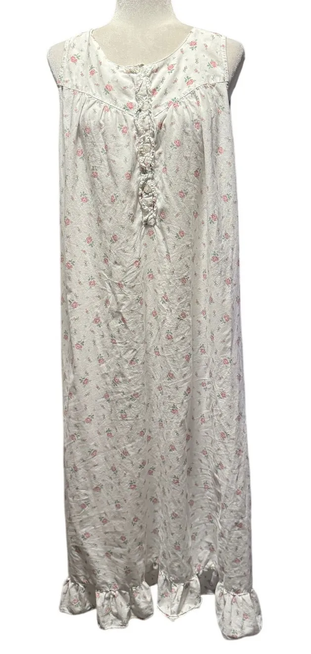 Laura Ashley Vintage Floral Nightgown – Soft Cotton, Ruffle Hem – XL – Made in USA Size: XL 100% Cotton Made in USA (classic vintage label) Sleeveless Ruffle hem Button-front placket with delicate ruffle trim Sweet floral pattern in pink + green Long, full flowy silhouette Measurements (flat-lay): Length: 50" Shoulder: 13.5" Pit to Pit: 24" Good pre-owned condition with no stains, no holes, and only minimal, normal signs of wash/wear. Fabric is very soft and cozy. cotton nightgown, vintage nightgown, cottagecore sleepwear, floral nightgown, prairie style, shabby chic, ruffle hem, cottage core, 80s nightgown, 90s nightgown, romantic floral, feminine sleepwear, pastel florals, summer nightgown, tradwife, modest dress