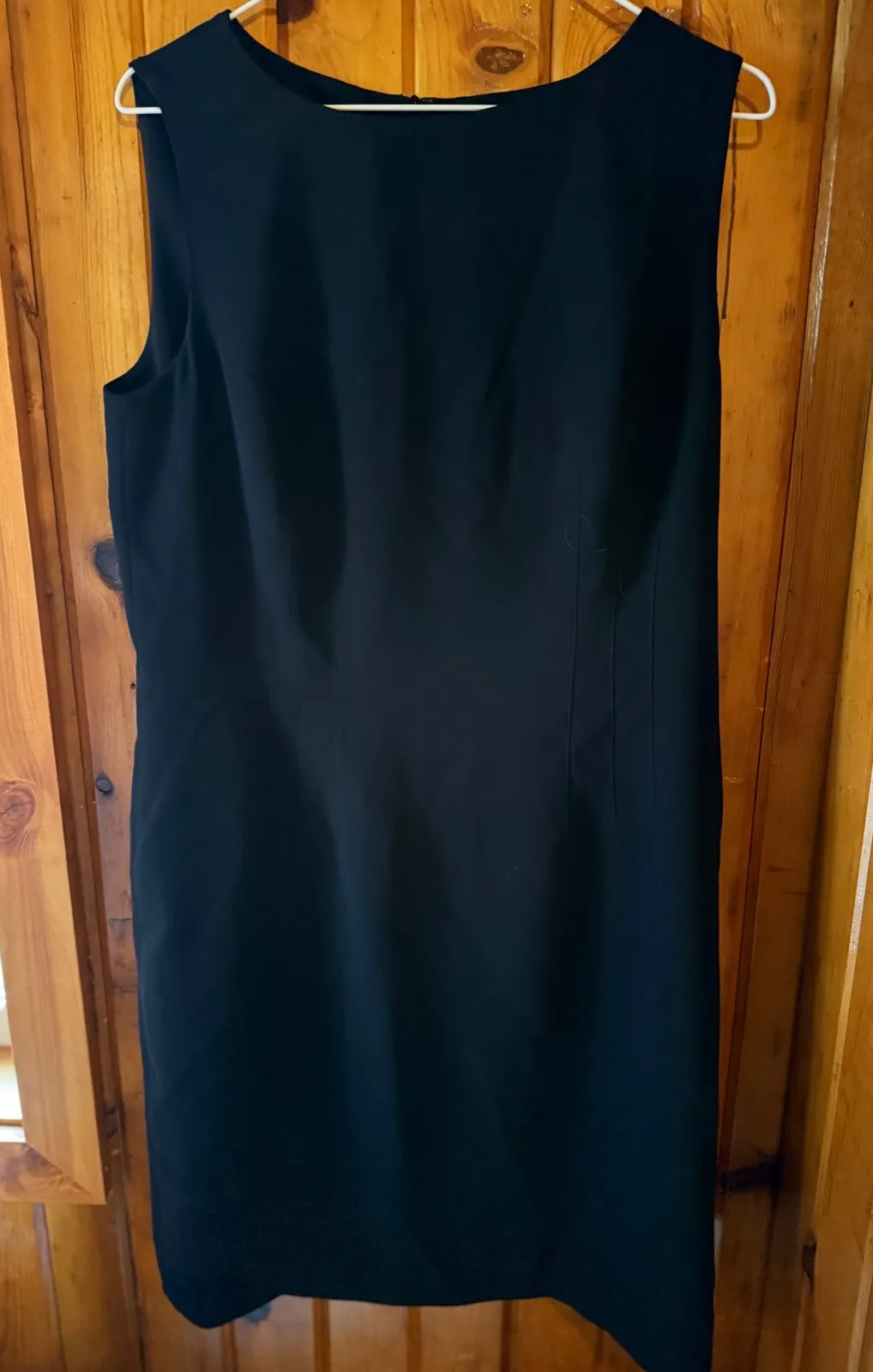 Chic simplicity takes center stage in this sleek sheath dress, perfect for any occasion. A timeless design features a classic round neckline and a flattering sleeveless cut, while subtle paneling creates a streamlined silhouette. Understated yet sophisticated, it transitions seamlessly from a professional work environment to an elegant evening event, making it a versatile addition to any wardrobe. Dress it up with heels for a cocktail party or pair it with a blazer for a day at the office. It would also make a great choice for a more formal church service. Pre-owned in good condition Keywords: sheath dress, black dress, sleeveless dress, cocktail dress, party dress, career dress, work dress, classic dress, knee length dress, laura scott, dress, women's dress, formal dress