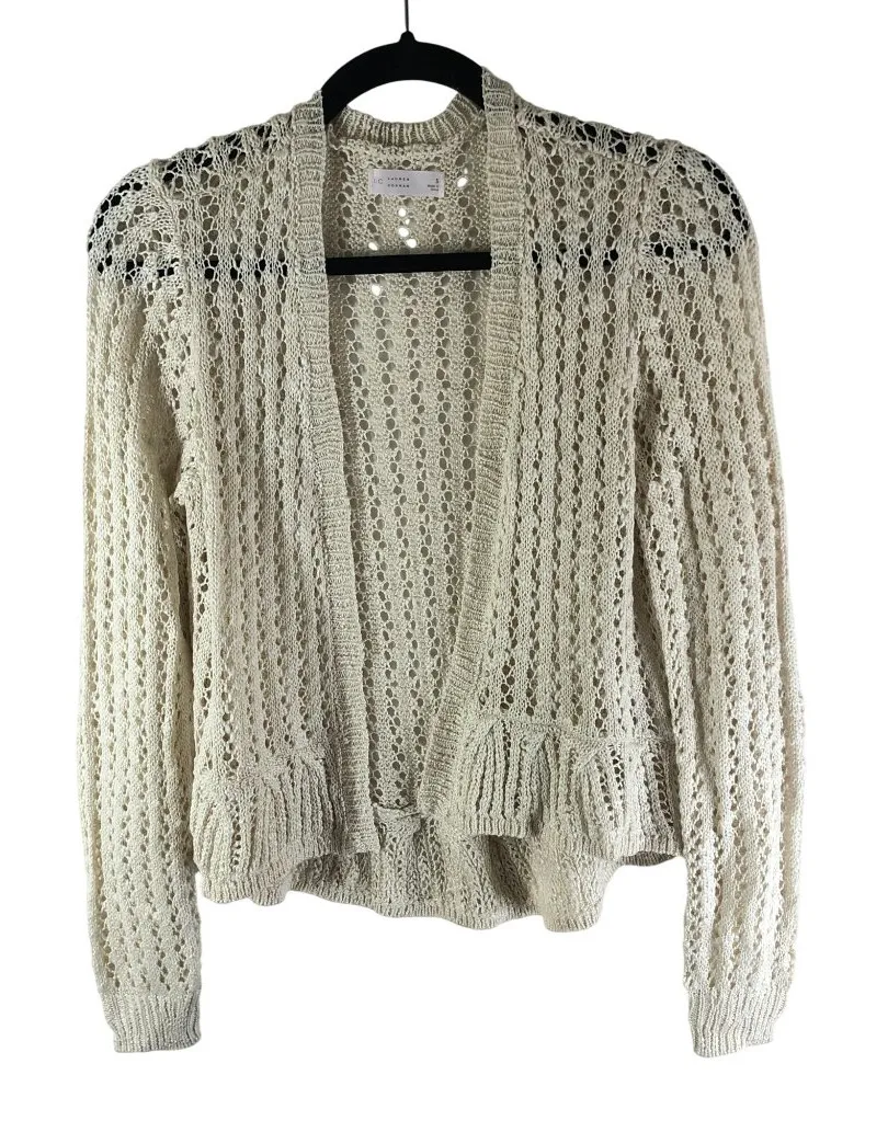 Item is in great pre-owned condition with no flaws! Armpit to armpit: 19 Length (shoulder to hem): 19/22 • Lightweight open-knit design • Ruffle hem detailing • Long sleeves for added coverage • Soft and cozy acrylic material Comes from a smoke free home. Feel free to ask any questions you may have. Thanks for looking!